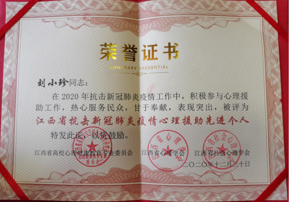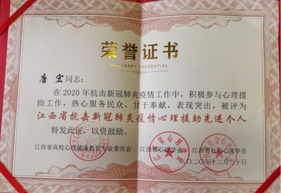 12月28-30日,江西省高校心理健康教育专业委员会、江西省心理学会和江西省社会心理学会联合举办的2020年学术年会在江西师范大学举行。大会表彰了一批全省抗击新冠肺炎疫情心理援助先进个人和先进集体,心理咨询中心唐宏、刘小珍荣获“江西省抗击新冠肺炎疫情心理援助先进个人”。